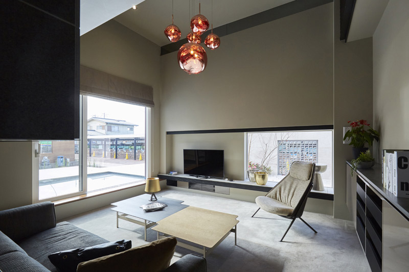 縦に広がる「吹き抜け」と大開口の窓はゆとりある生活を演出する。大小サイズの違った照明とバイオエタノールの暖炉はこだわりのインテリアコーディネート。