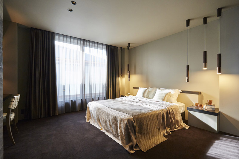 快適で上質な暮らしを寝室にも。まるでホテルに来たような空間に、見せる収納を体現するガラス張りのドレスルーム。