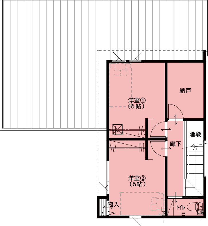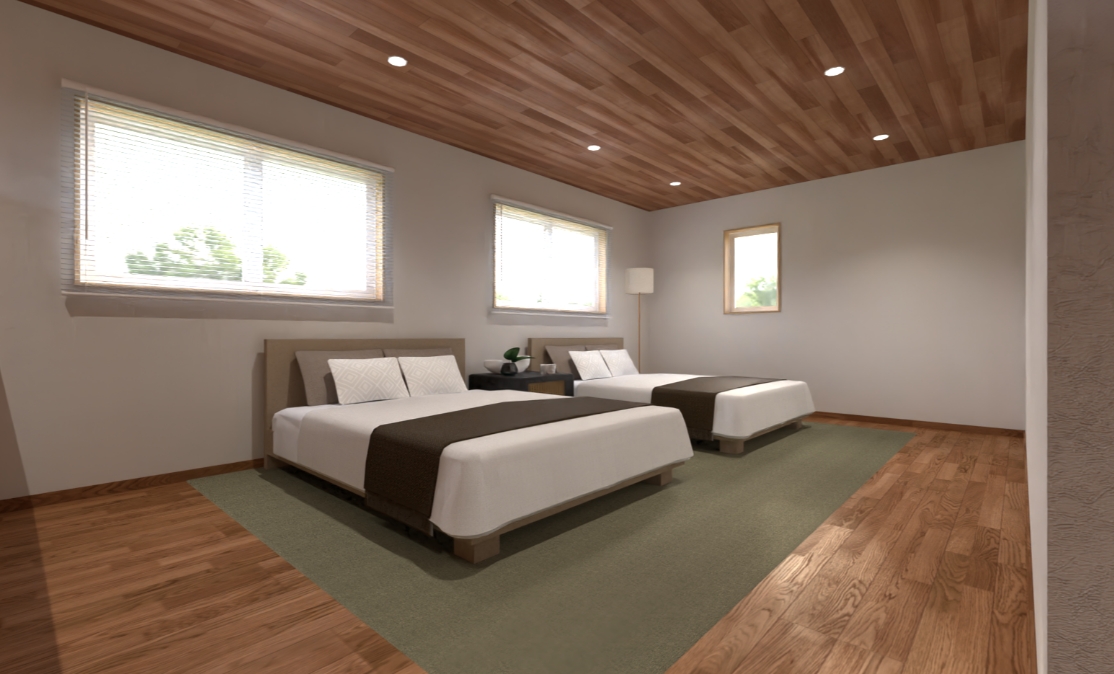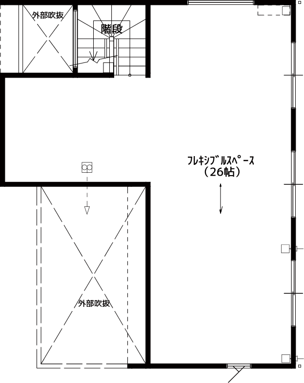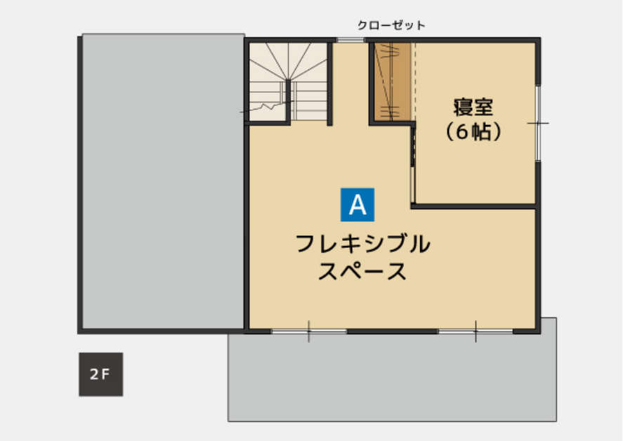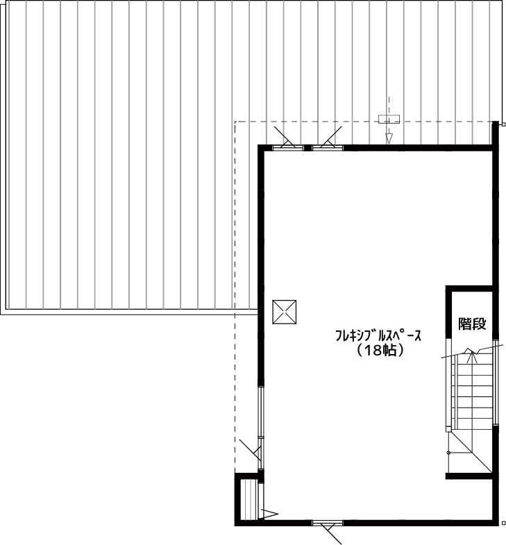このフレキシブルスペースは、可変性を持たせられる空間。窓も2つ配置されているので、2部屋に区切りやすく、光を取り入れられる。
