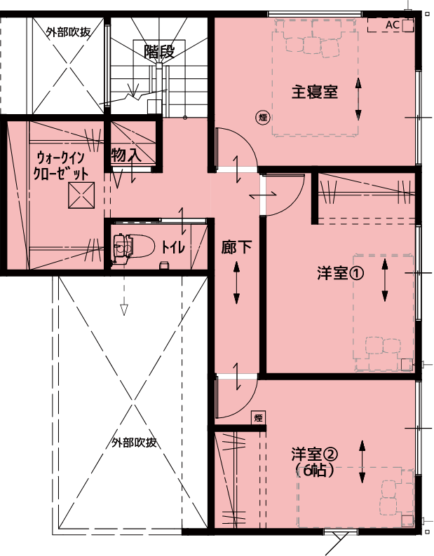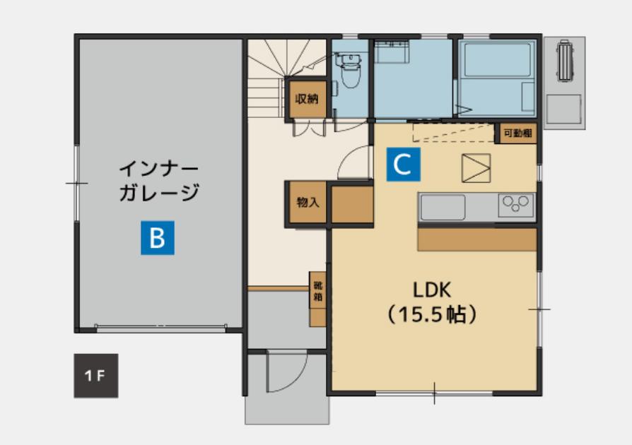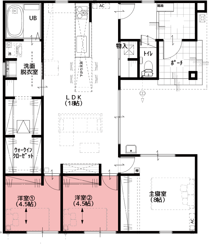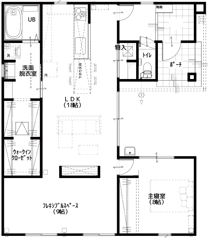 主寝室にはウォークインクローゼットを、玄関には土間収納を配置することで大収納を実現します。