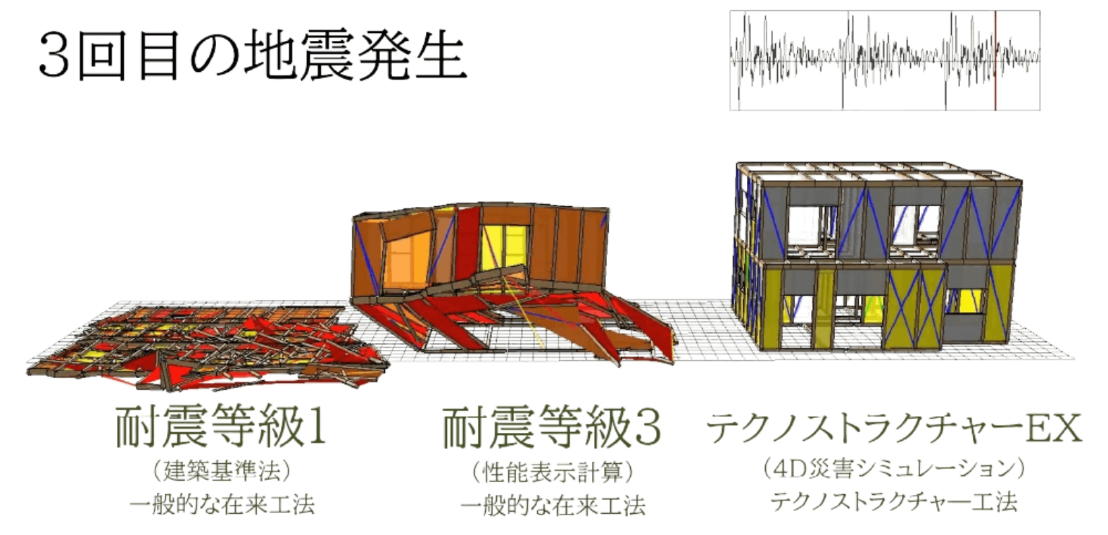 震度7クラスに3回耐えられるかの検証を、仮想空間上のシミュレーションで行います。