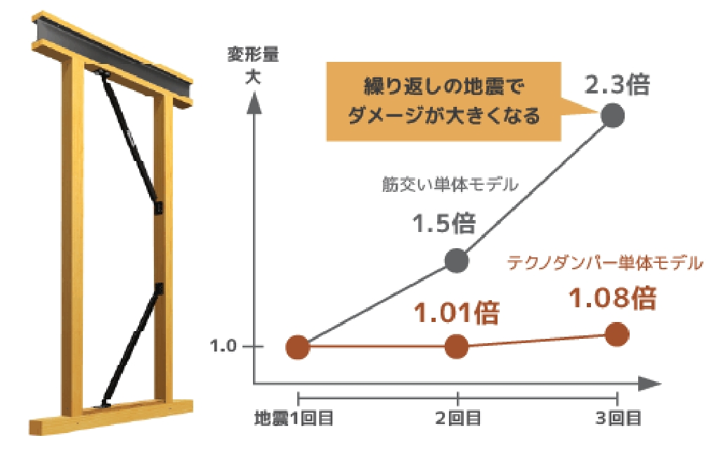 テクノダンパーの有無による変形抑制効果では、それぞれの1回目の変形量を1とし、2回目以降の変形の拡大割合を数値化。
