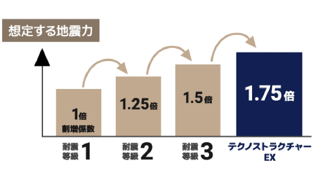 しかも、テクノストラクチャーEXは、国の最高基準である耐震等級3を超える地震力1.75倍を想定して構造計算をしています。