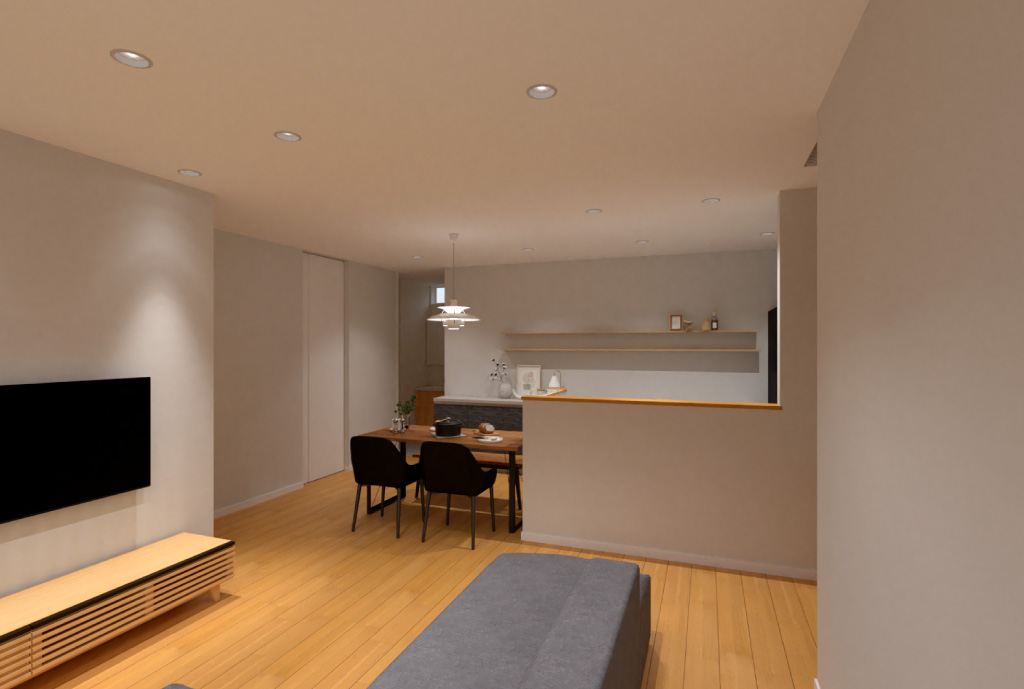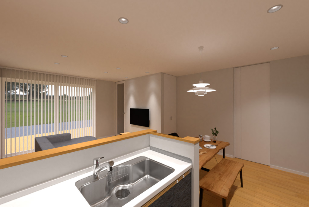 キッチンに大容量のカップボードを設け、収納力と使い勝手を両立しました。