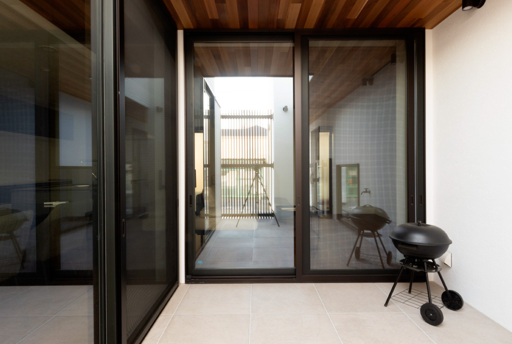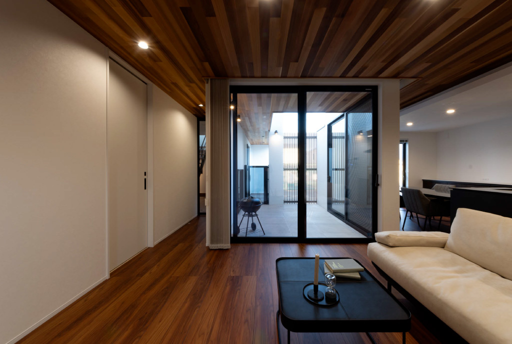コートヤードとLDKの天井を同一素材で仕上げることで、視線も気持ちも自然と外へつながり、内と外が一体となるような広がりを生み出しています。