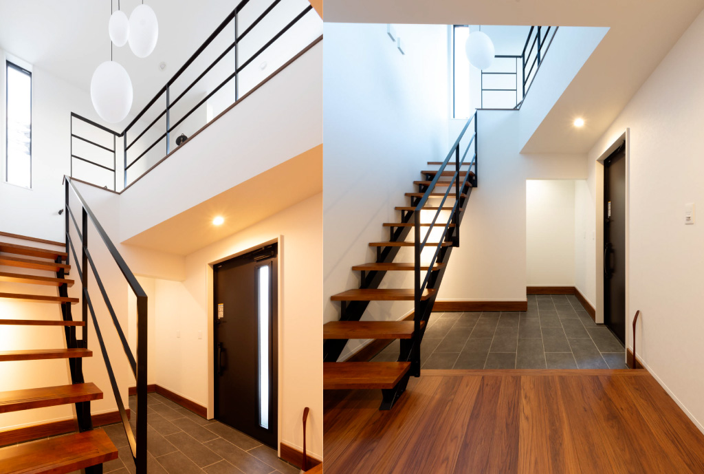 横のつながりだけでなく、吹き抜けと鉄骨階段は上下の空間をゆるやかにつなぎ、玄関ホールに奥行きと開放感をもたらします。