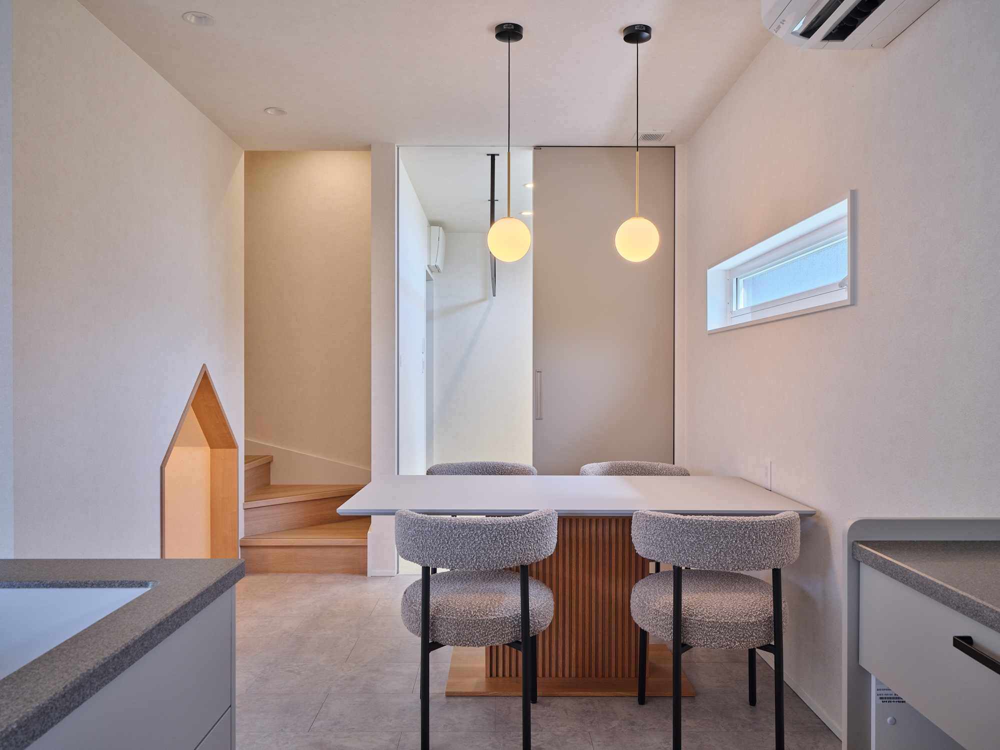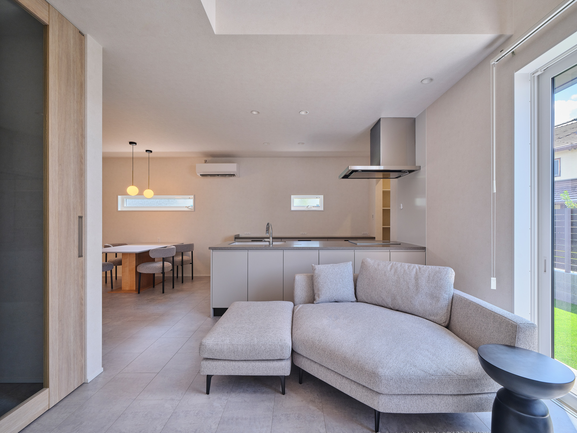 実際に住み始めて、家の中はもちろん、庭でも愛犬と遊べるようになったことが何よりの変化です 。驚いたのは断熱性能の良さで、朝から夜まで室温が一定に保たれ、とても快適に過ごせています 。特にお気に入りの場所は、吹き抜けから自然光がたっぷりと差し込む心地よいリビングと、広々としたキッチンです 。使い勝手の良いキッチンのおかげで、日々の料理もストレスなく楽しめています 。また、営業の末澤さんはレスポンスが非常に早く、家づくりの過程で生まれた小さなモヤモヤもすぐに解決してくれたので、最後まで大きな安心感がありました 。
