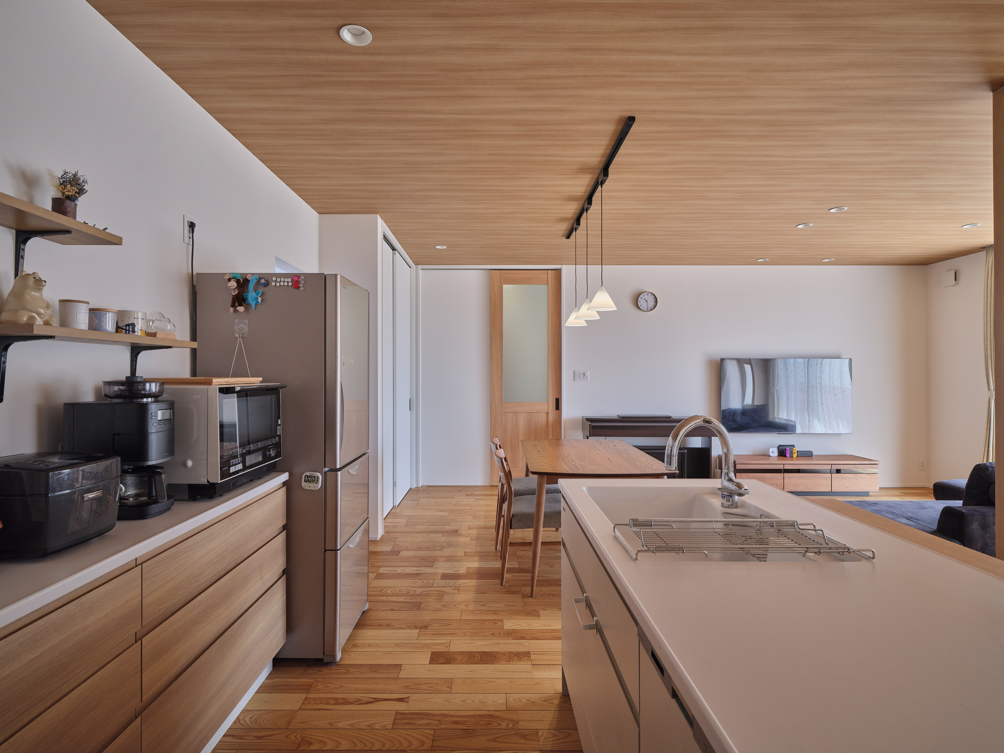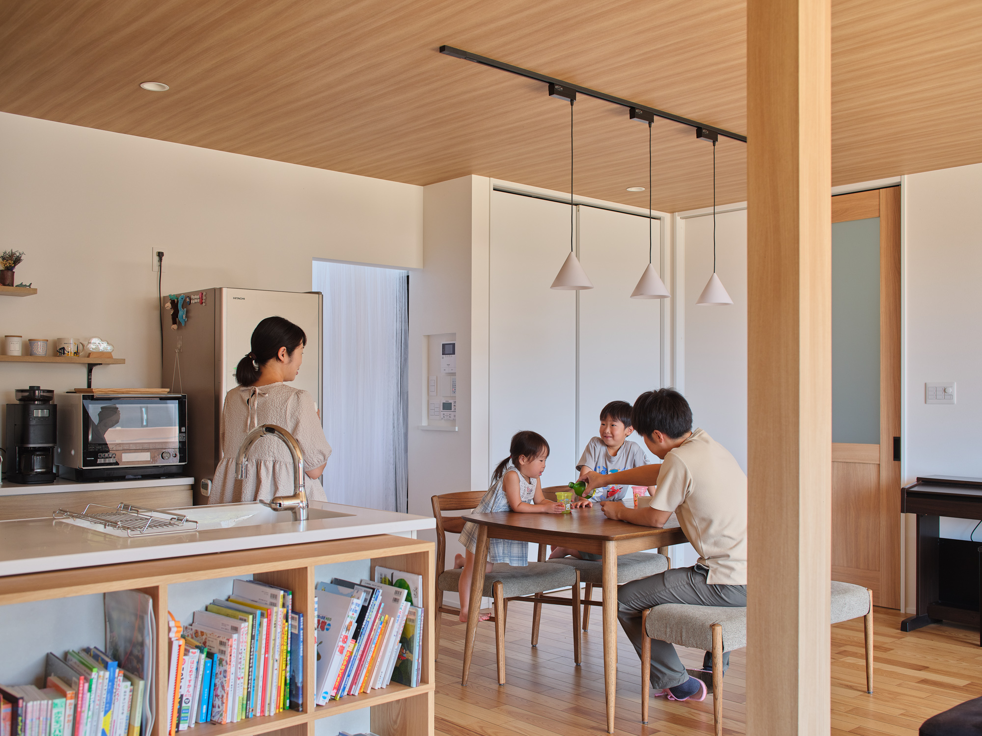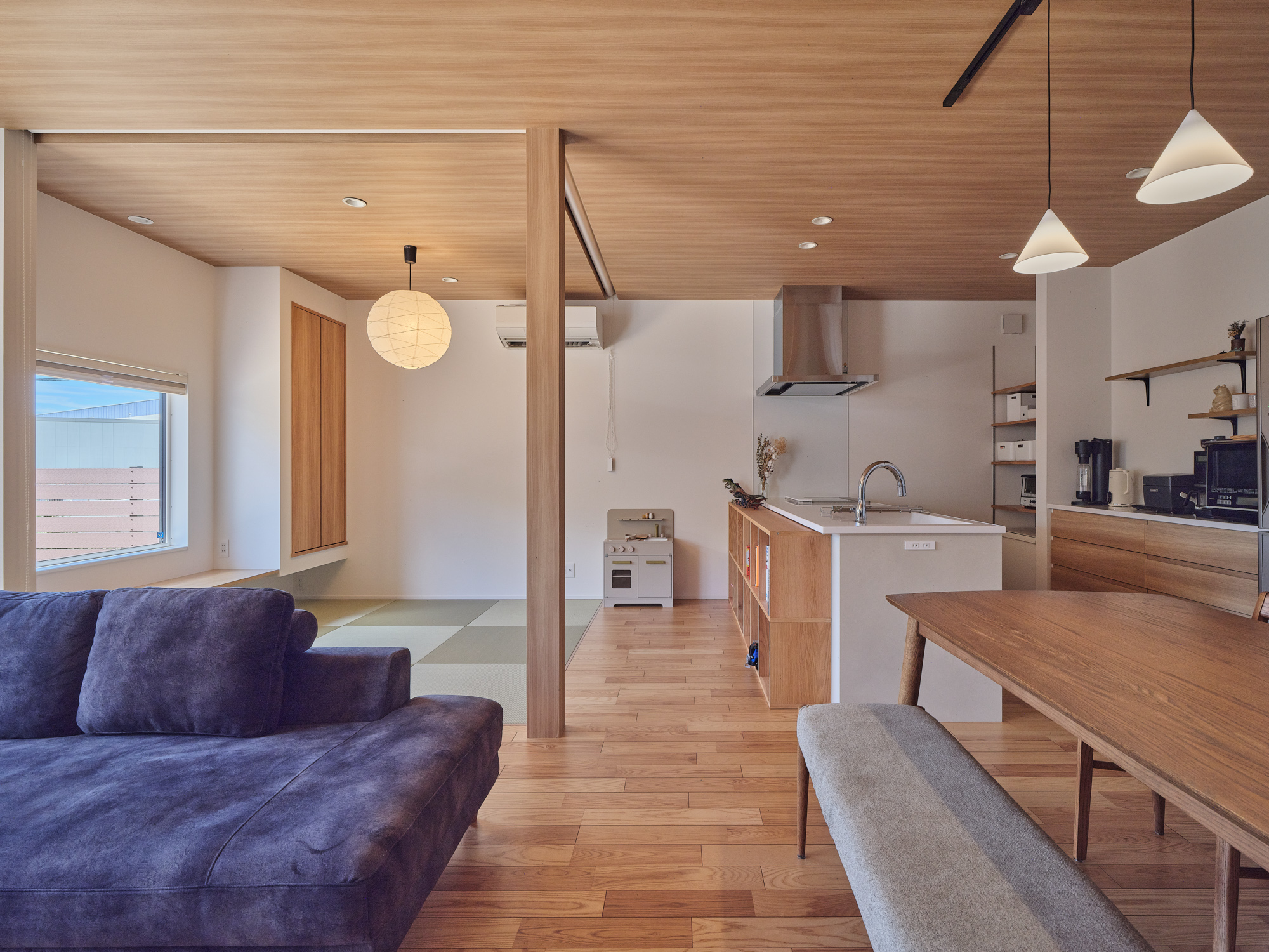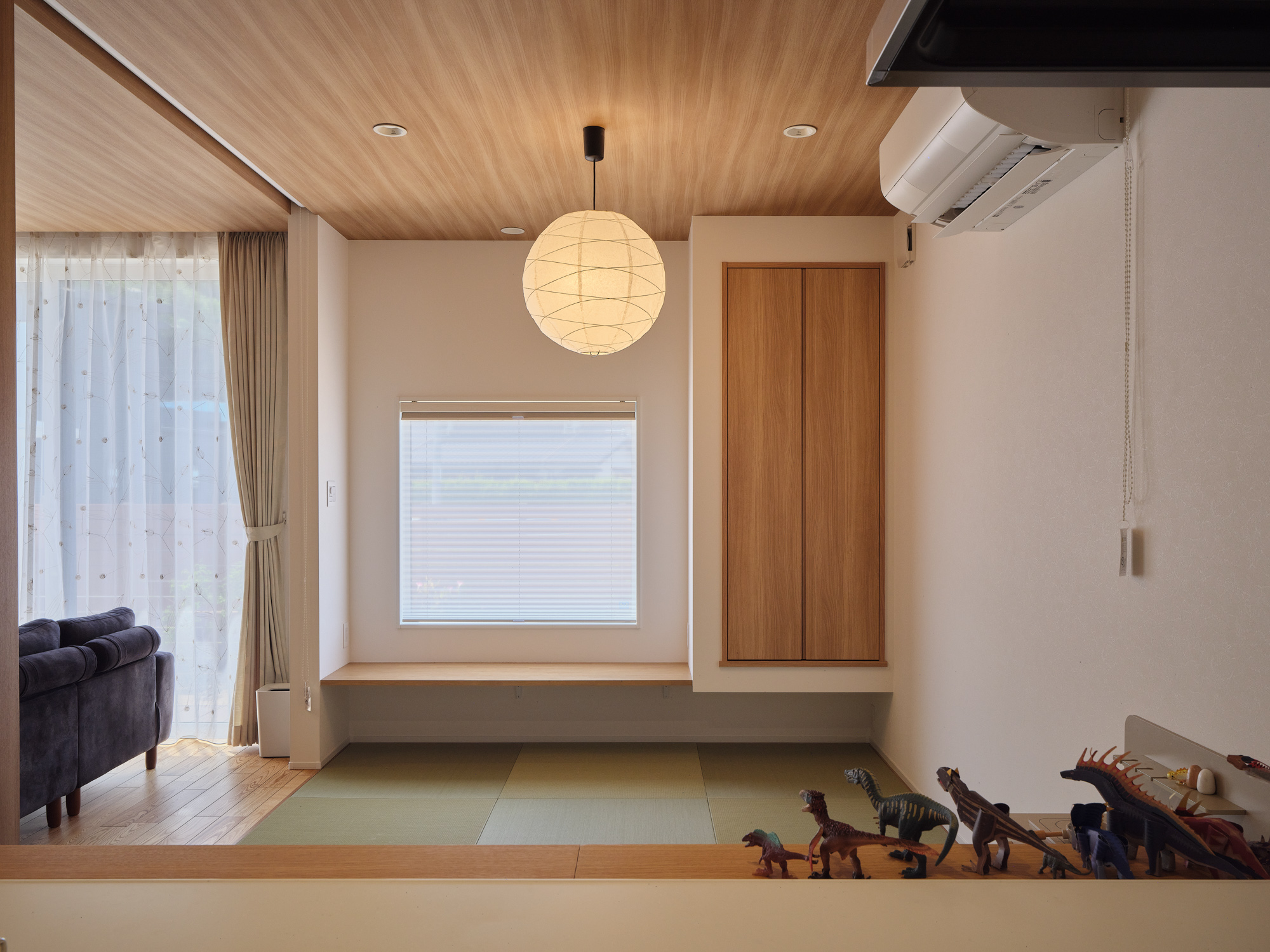 一番のこだわりは、LDKの南面に大きく配置した窓です 。そこから差し込む自然光を浴びながら、子どもたちと畳でくつろぐ時間は、何物にも代えがたい幸せです 。太陽の光だけでここまで明るく、暖かいんだと驚きました。天気の良い冬の日なら、暖房なしで過ごせることもあるほどです 。また、キッチンとダイニングを横並びにしたことで配膳がぐんと楽になり、家事のストレスも減りました 。住み始めてからも、ちょっとしたことで連絡をすればすぐに対応してもらえるアフターフォローの速さには、本当に安心しています 。