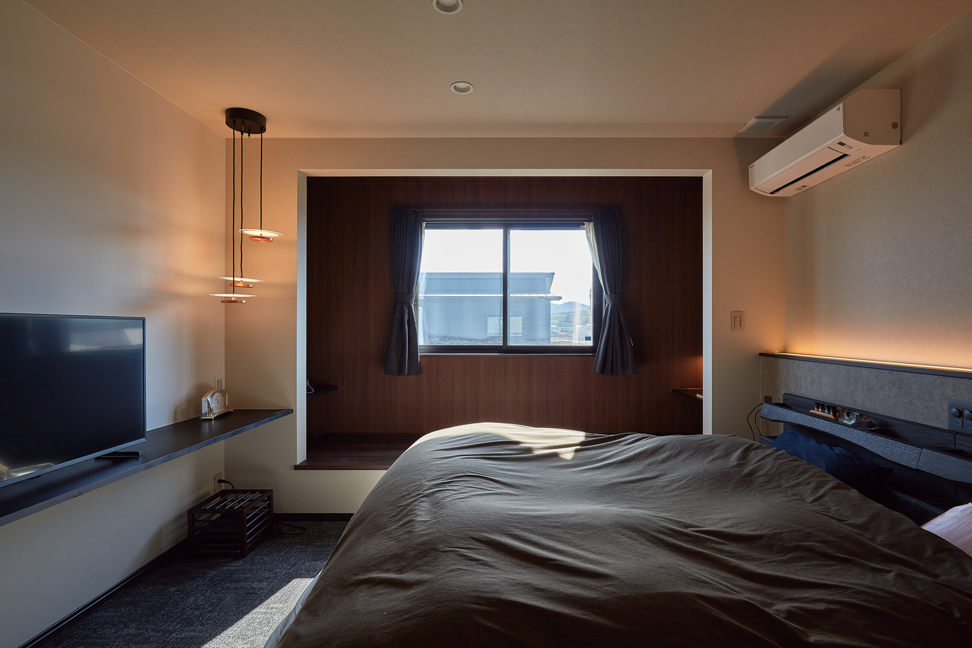 実際に住み始めて、キッチン周りが広くなり動線がスムーズになったことで、以前感じていたストレスがすっかりなくなりました 。当初の希望だった「ホテルライクな空間」も見事に叶っています 。特にこだわったのは、リラックスするための工夫です。約20帖の広々としたLDKに加え、寝室にはキングサイズのベッドを置いても余裕のある広さを確保しました 。ご主人お気に入りの寝室には、間接照明を仕込んだ腰壁や、一人で勉強やリラックスができる「ヌック」を設けています 。また、お風呂も足を伸ばせる大きな浴槽とLEDの調光ライトを採用し、毎日が非日常の癒やしに包まれています 。