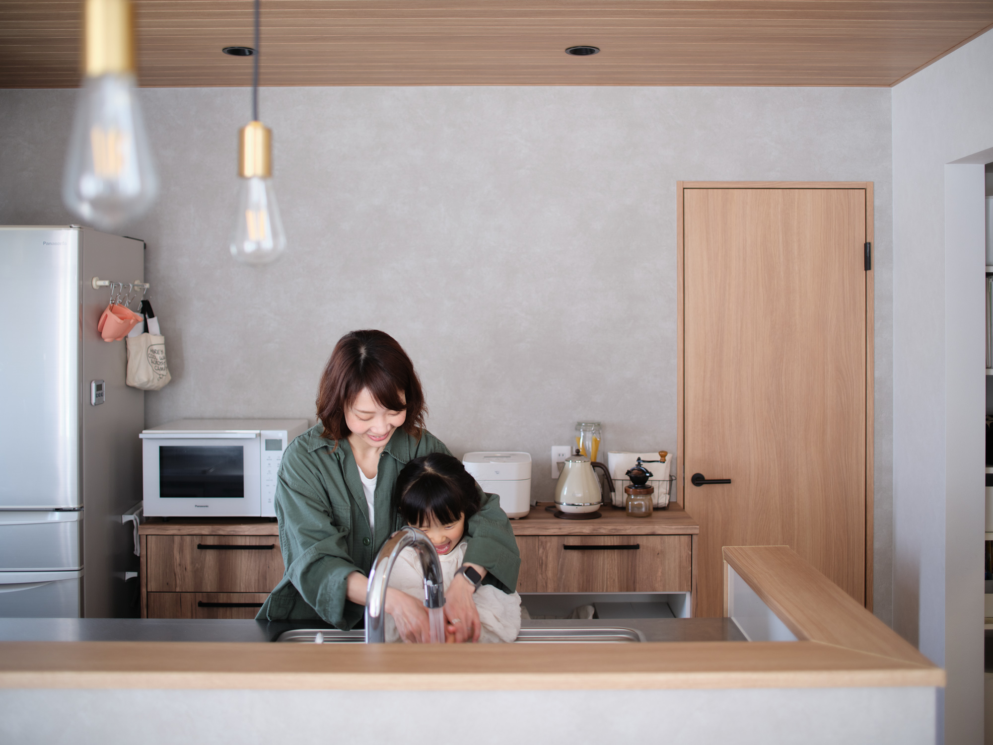 実際に住んでみて一番驚いているのは、断熱性の高さです。冬場、エアコンを切って外出しても、帰宅したときに家の中がまだ暖かい。あの「ふわっ」とした温もりを感じるたびに、幸せを実感します。こだわった間取りの中でも、特にキッチン横のパントリーは大正解でした。片面はキッチン用品、もう片面はハンガーパイプを設置して、子どもたちのランドセルや制服を掛けられるようにしたんです。おかげで忙しい朝も、2階に上がることなく1階だけで準備が完結します!また、提案してもらった回遊動線も驚くほど便利で、広くなったキッチンでの料理や片付けが、今ではお気に入りの時間になりました。自分たちのこだわりと、プロならではの提案がズレなく形になった満足感でいっぱいです。